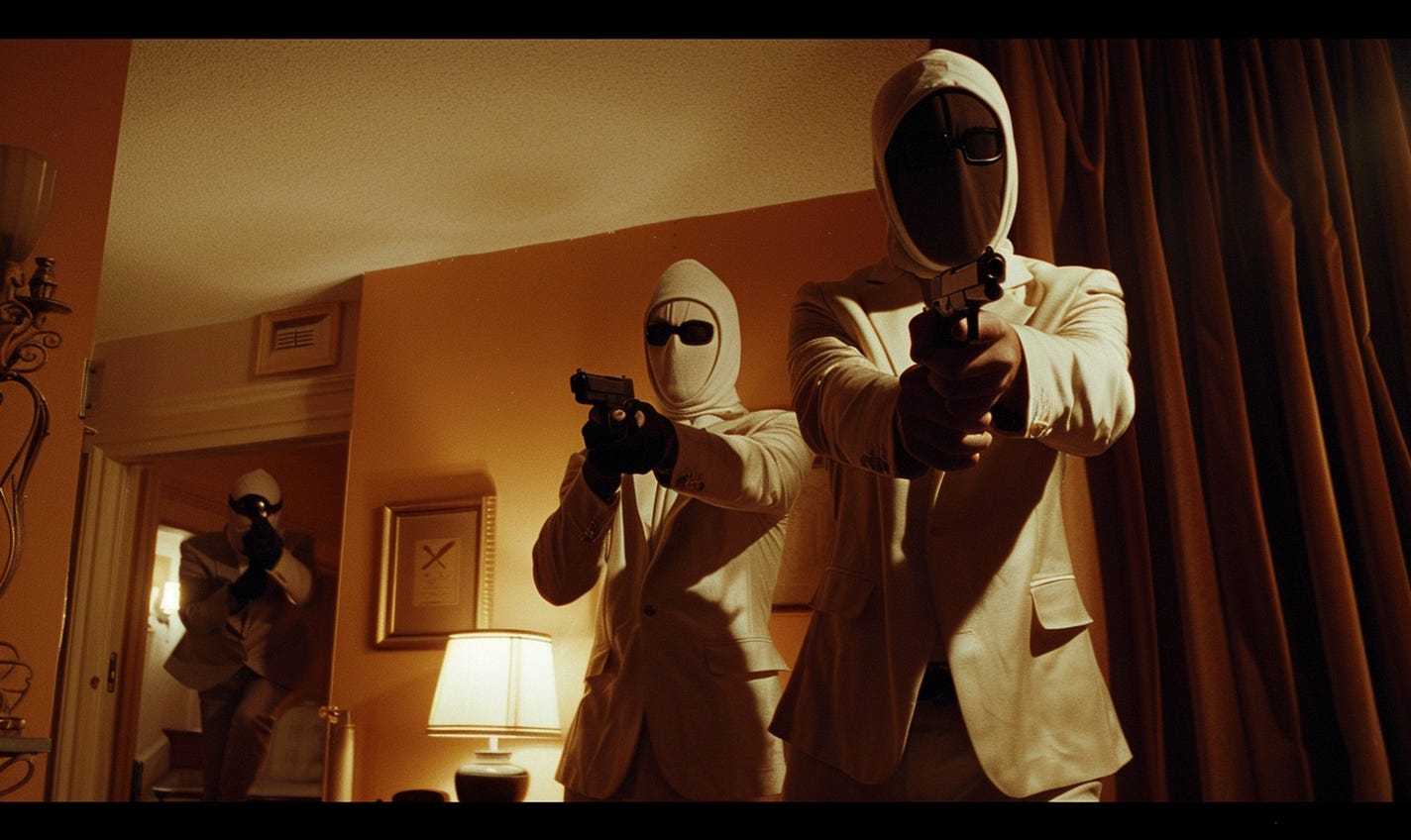 3 masked men bumrush the door, all brandishing pistols. JAKE pistol whips the homeowner as JACOB runs further into the home. JACOBY closes up the door and locks it.